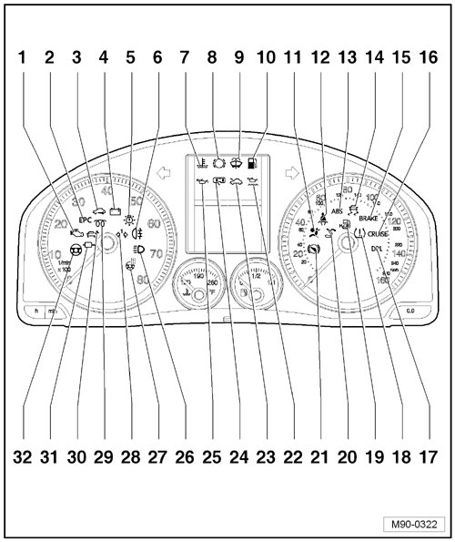 • Different instrument clusters are used, depending on vehicle equipment. Therefore, the arrangement of the control lamps may deviate from the illustration.