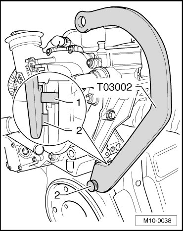 • When removing, the engine lateral bracket (T03001) must be held at tension in the direction of withdrawal, otherwise the bolt - 1 - cannot be unscrewed.