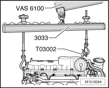 - Install the lifting tackle (3033) as shown and lift the engine off from the engine-/gearbox jack (V.A.G 1383 A) using the shop crane -load cap= 700-1200KG (VAS 6100).
