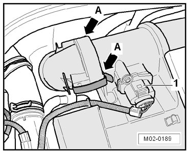 - Release the clamp from the mass air flow (MAF) sensor - arrow B - with the spring-type clip pliers (VAS 5024A) and push it back.