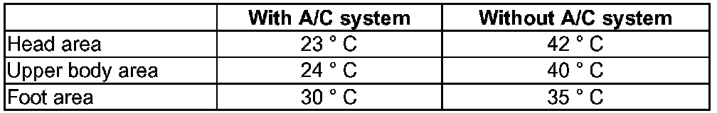 - Pleasant temperature levels (example: Mid-size car after short travelling time, ambient temperature 30 degrees C in the shade and vehicle exposed to sunlight).