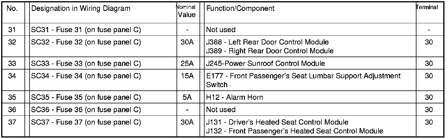 Fuses (SC) On Fuse Panel C (electronics Box Low) , from May 2005