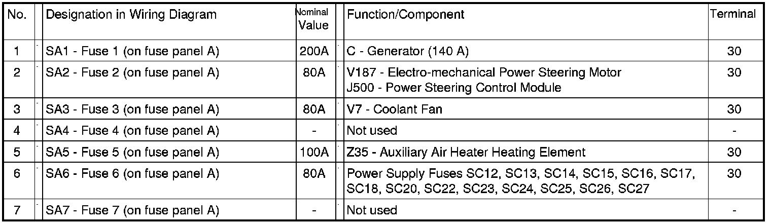 Fuses (SA) on fuse panel, on electronics box High, from November 2004