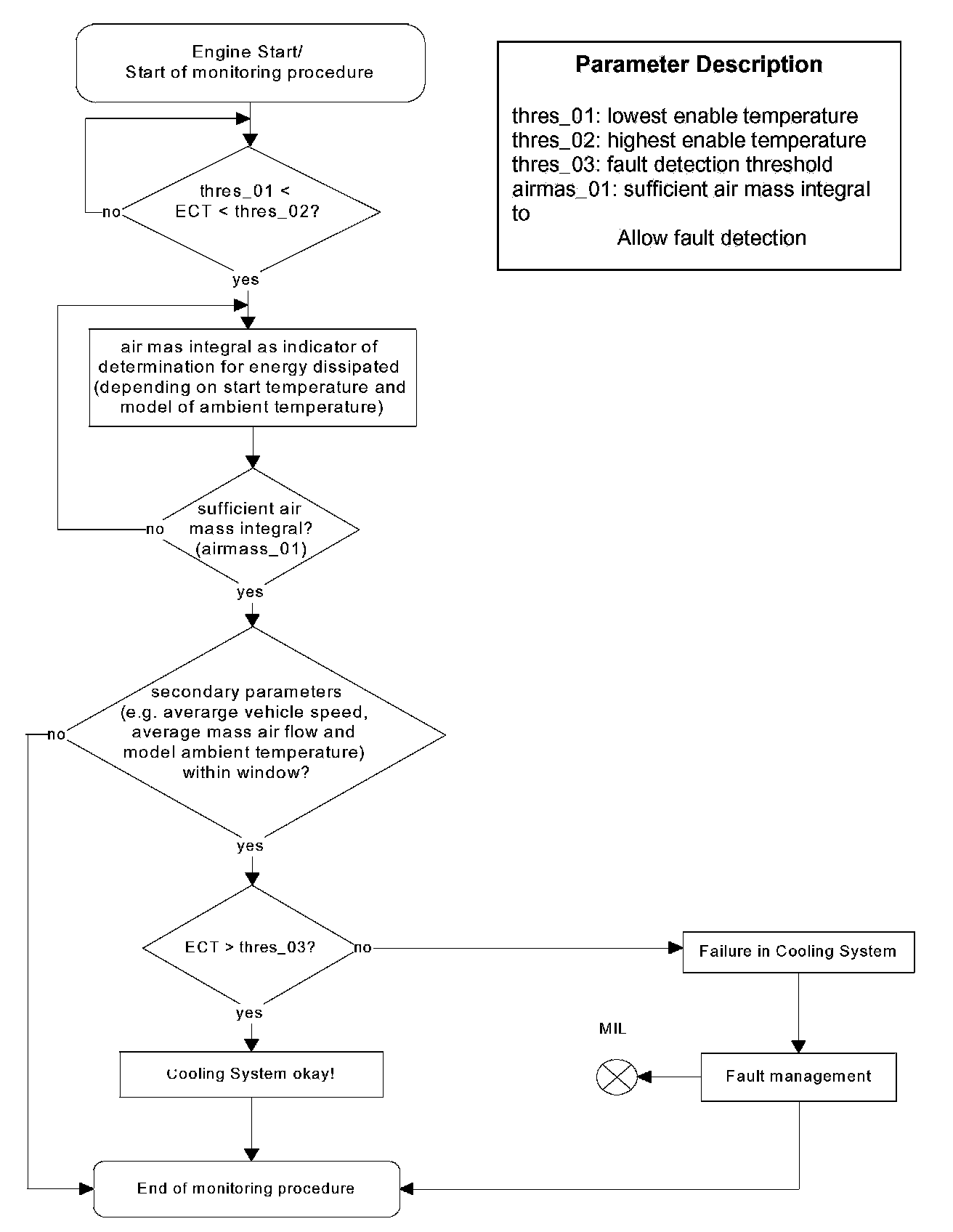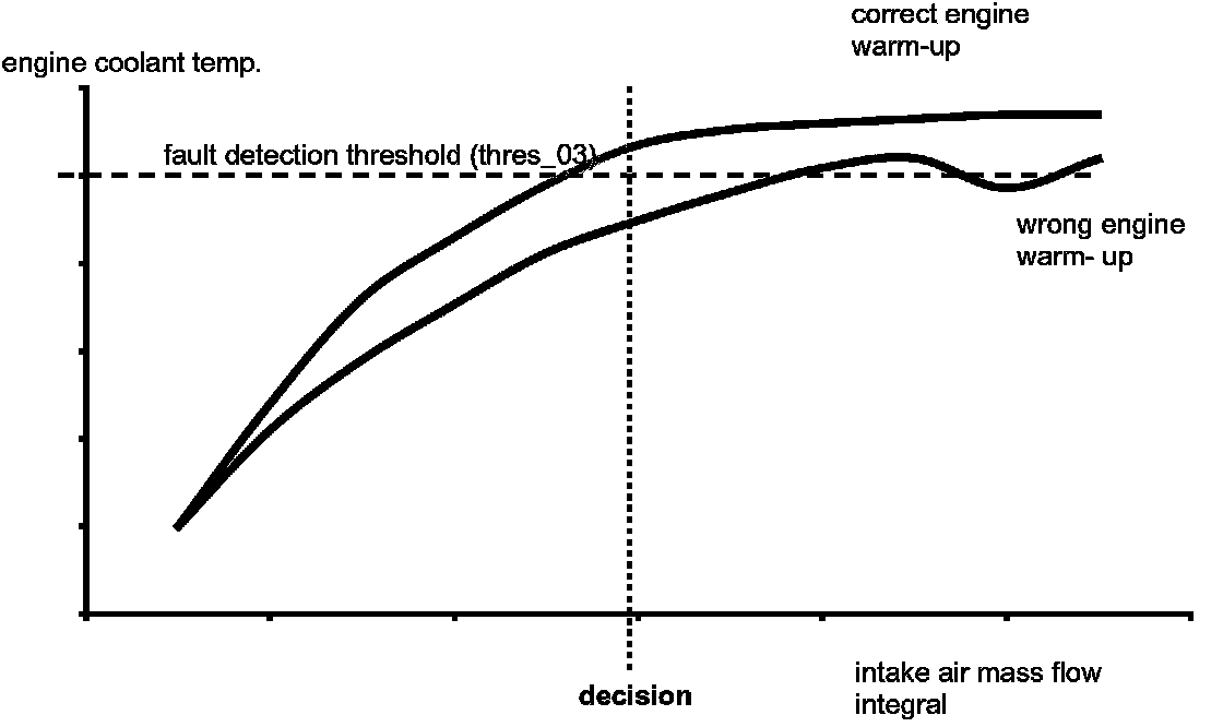 In case that the engine coolant temperature does not reach an certain value after a sufficient mass air flow under normal driving conditions, the cooling system performance is considered to be reduced.