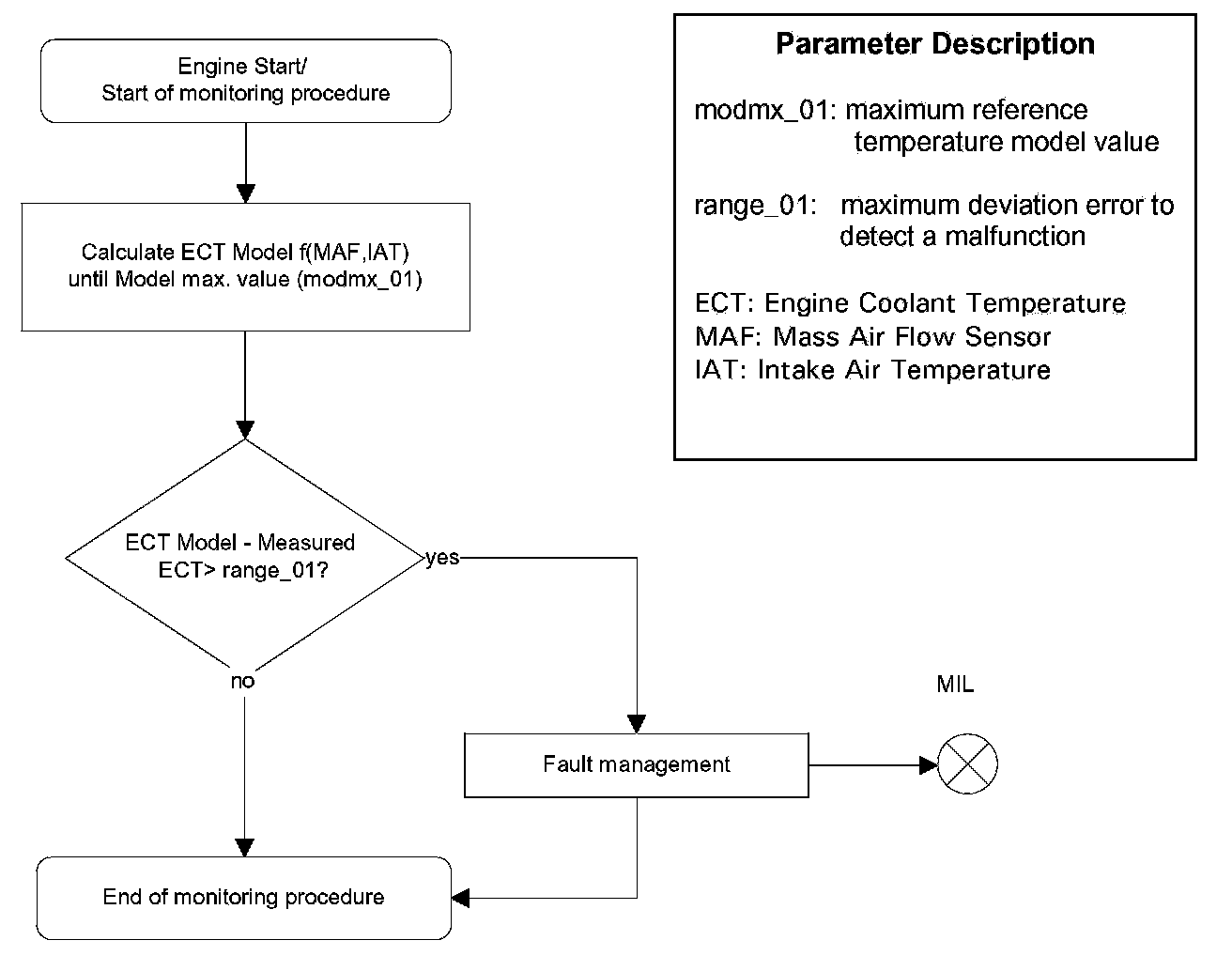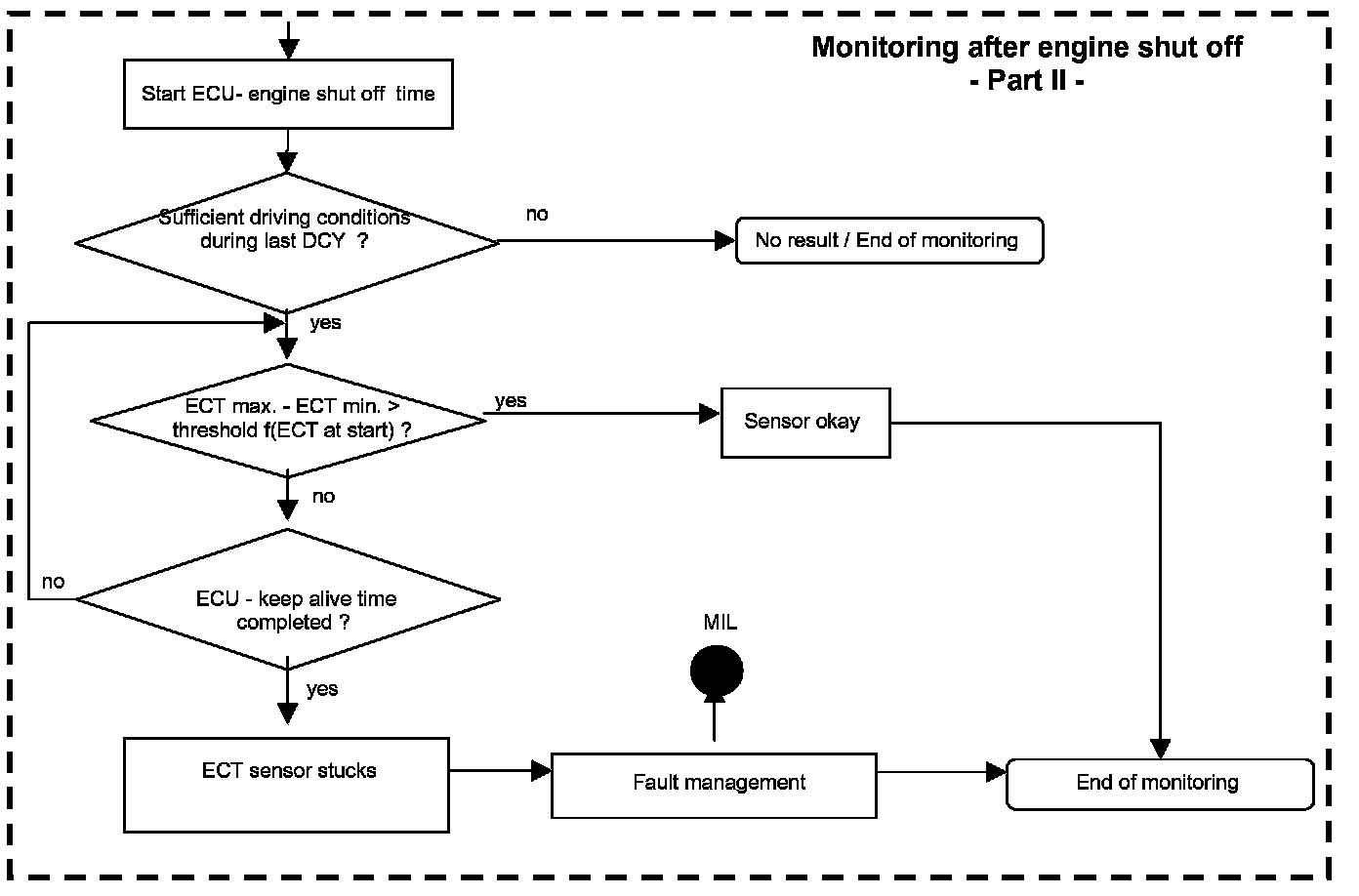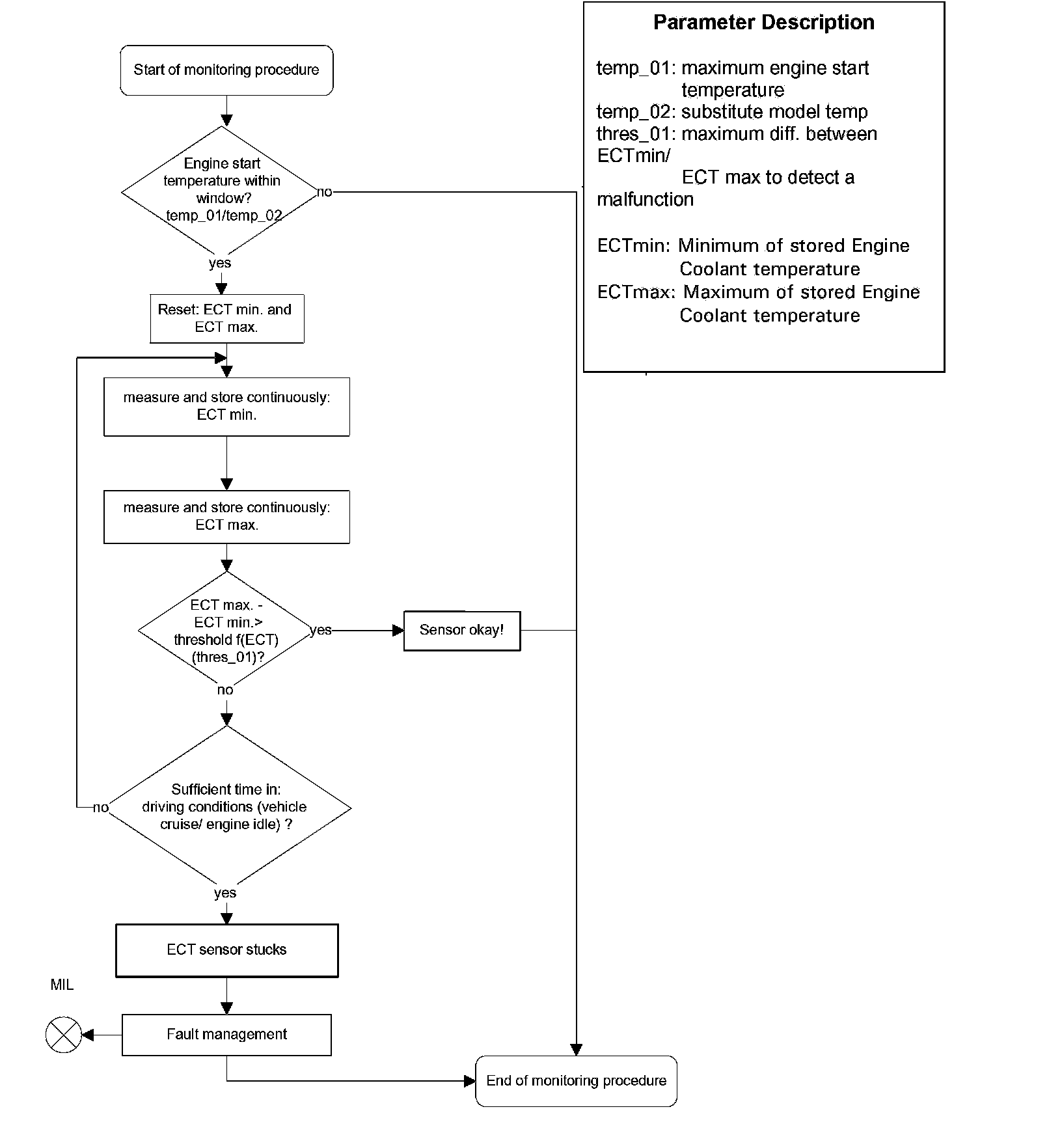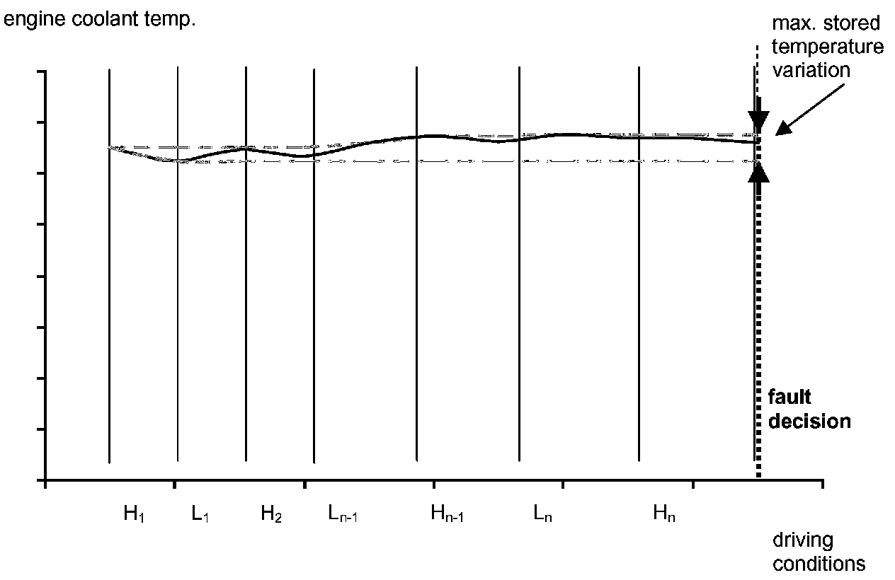 After engine start the system stores continuously the lowest and highest ECT below the thermostat control temperature for a driving cycle. In case that after several driving conditions the difference between ECT max and ECT min is lower than the threshold the sensor stuck at low values.