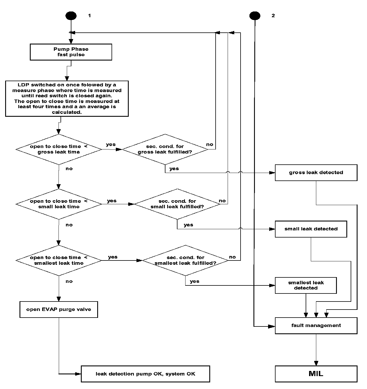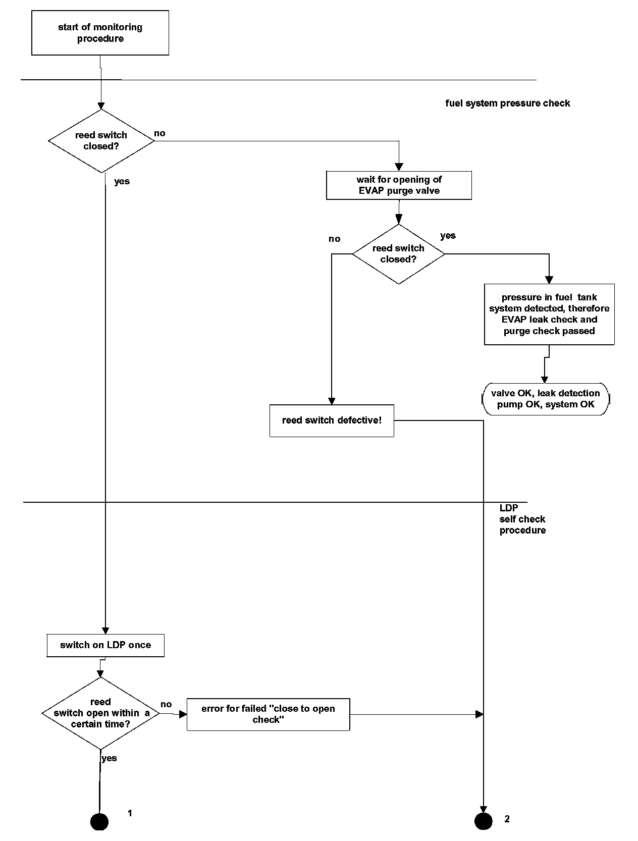 The first step of leakage diagnostics is the pressure check of fuel tank system by testing the reed switch. In case of an open reed switch, the fuel tank system has sufficient pressure for the sealed check and no further pressure has to be supplied to the fuel tank system by the LDP. The diagnosis is waiting until the EVAP purge valve is opened in order to purge the carbon canister. In case the reed switch remains open or the reed switch stuck open, the reed switch is defective.