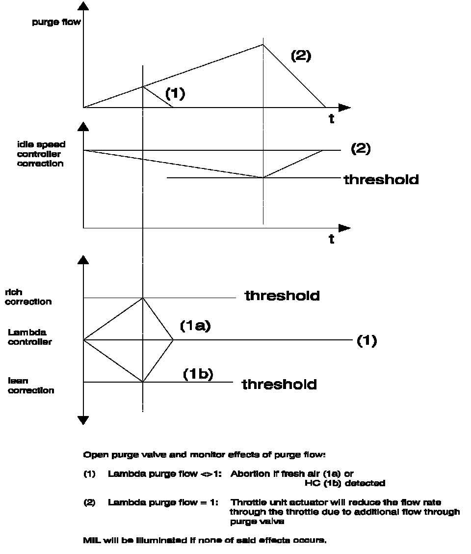 In this case, the Lambda controller does not need to compensate for a deviation. However, when the EVAP Purge Valve is completely opened, the cylinder charge increases significantly. Therefore, flow through the throttle unit must be decreased in order to maintain the desired idle speed. Flow through the EVAP Purge Valve is assumed when the flow through the throttle unit is reduced by idle control. If both mixture compensation and reduction of the airflow through the throttle unit does not occur for two diagnosis cycles, then a defective EVAP Purge Valve is assumed and the MIL is illuminated.