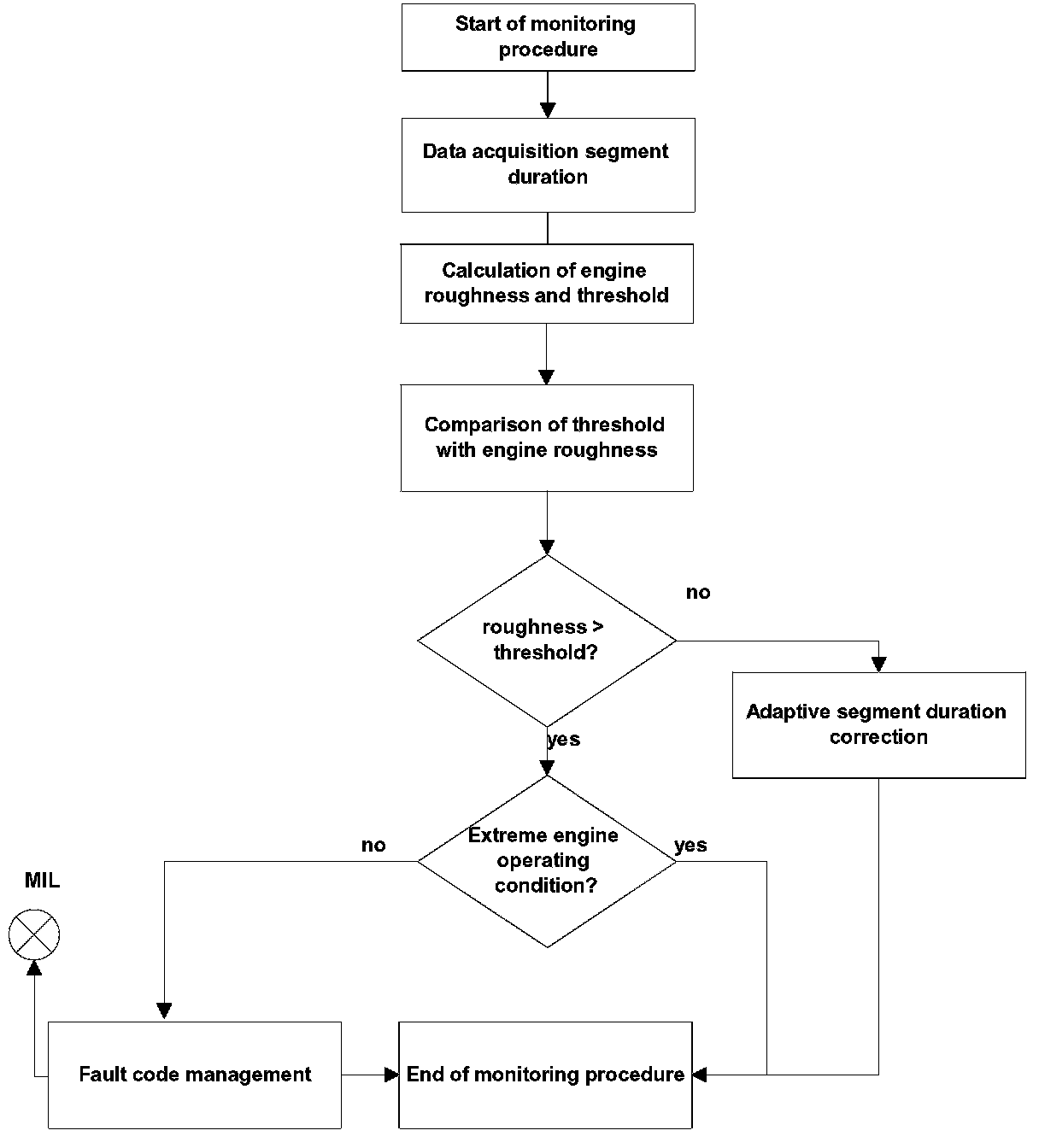 To avoid noise effects, all engine roughness values are low pass filtered and the detection threshold is corrected by the mean value of the filters. Therefore the amplitude to noise ratio improves and the sensitivity for misfire detection of continuous misfiring cylinders increases.