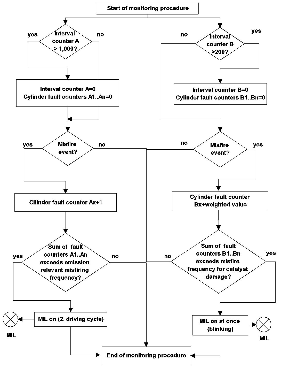 If the sum of cylinder fault counters exceeds a predetermined value, the fault code for indicating catalyst damage relevant misfiring is stored and the MIL is illuminated with "on/off"-sequence once per second (blinking).