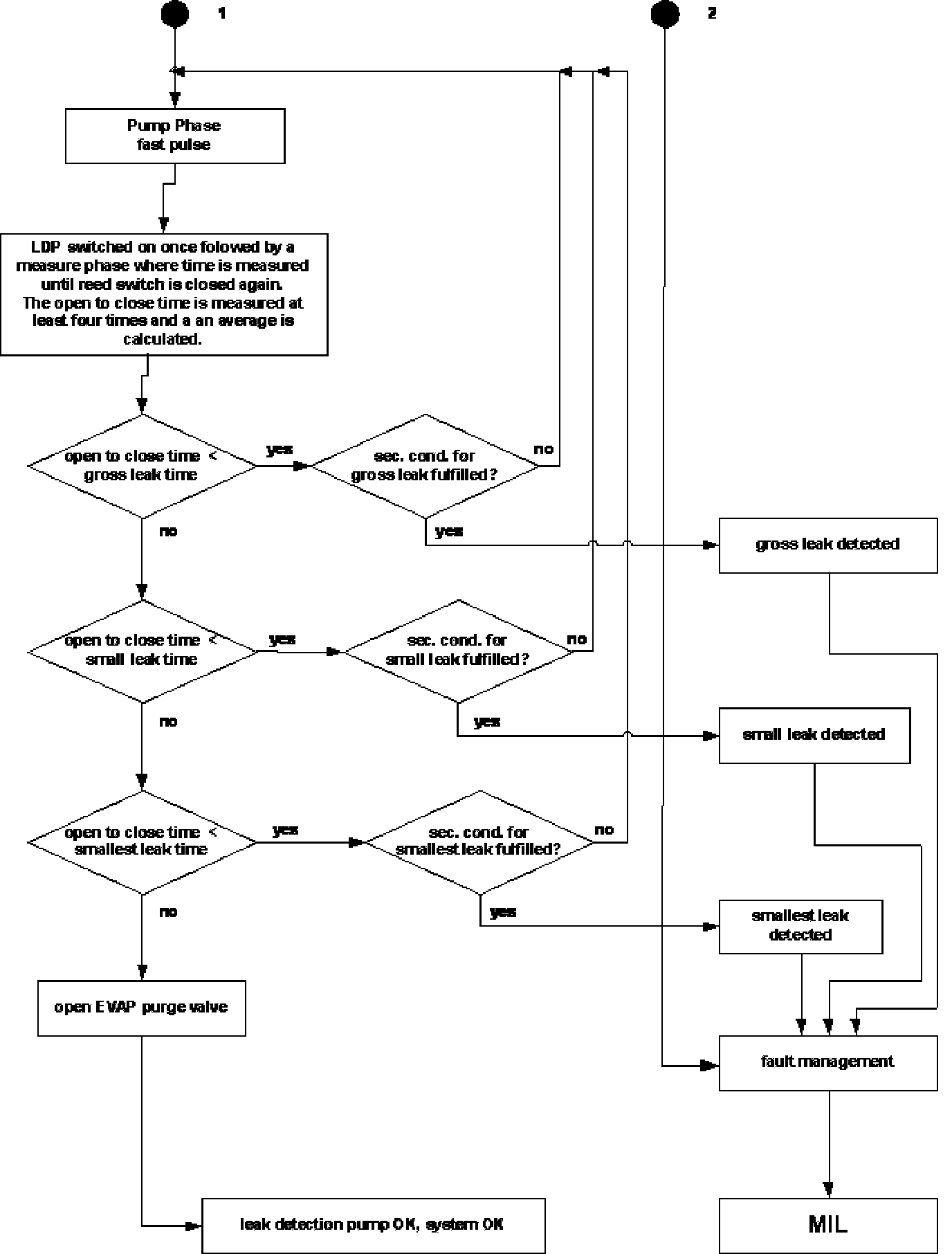 The first step of leakage diagnostics is the pressure check of fuel tank system by testing the reed switch. In case of an open reed switch, the fuel tank system has sufficient pressure for the sealed check and no further pressure has to be supplied to the fuel tank system by the LDP.