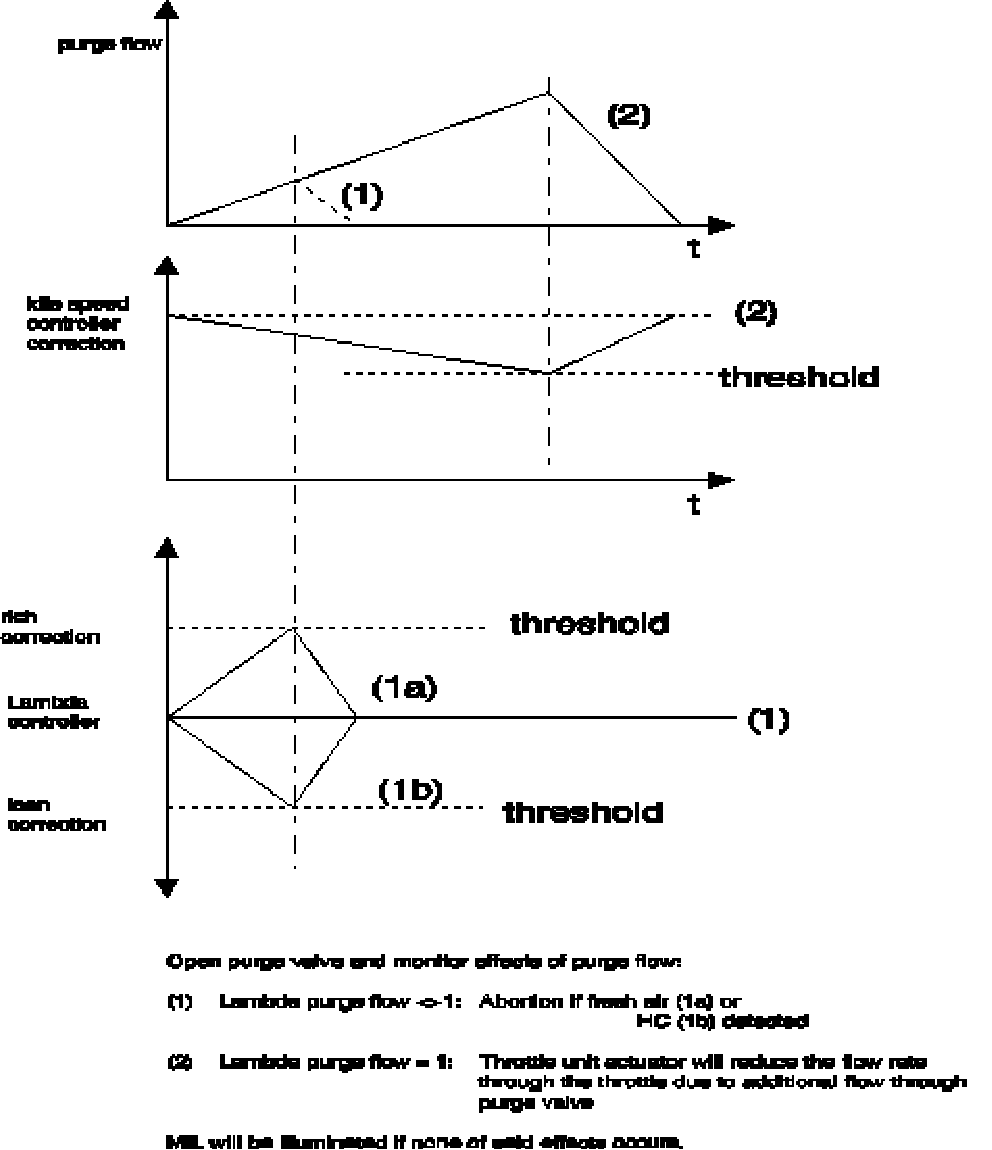 In this case, the Lambda controller does not need to compensate for a deviation. However, when the EVAP Purge Valve is completely opened, the cylinder charge increases significantly. Therefore, flow through the throttle unit must be decreased in order to maintain the desired idle speed. Flow through the EVAP Purge Valve is assumed when the flow through the throttle unit is reduced by idle control. If both mixture compensation and reduction of the airflow through the throttle unit does not occur for two diagnosis cycles, then a defective EVAP Purge Valve is assumed and the MIL is illuminated.