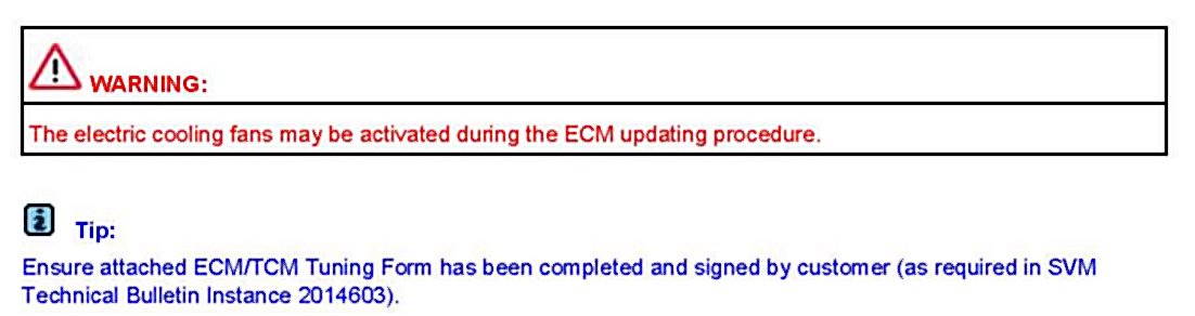 Current Tuned ECM or TCM requirements: If you encounter a vehicle with a "Tuned" ECM or TCM, your dealership must do the following before performing any procedure that updates ECM or TCM programming: