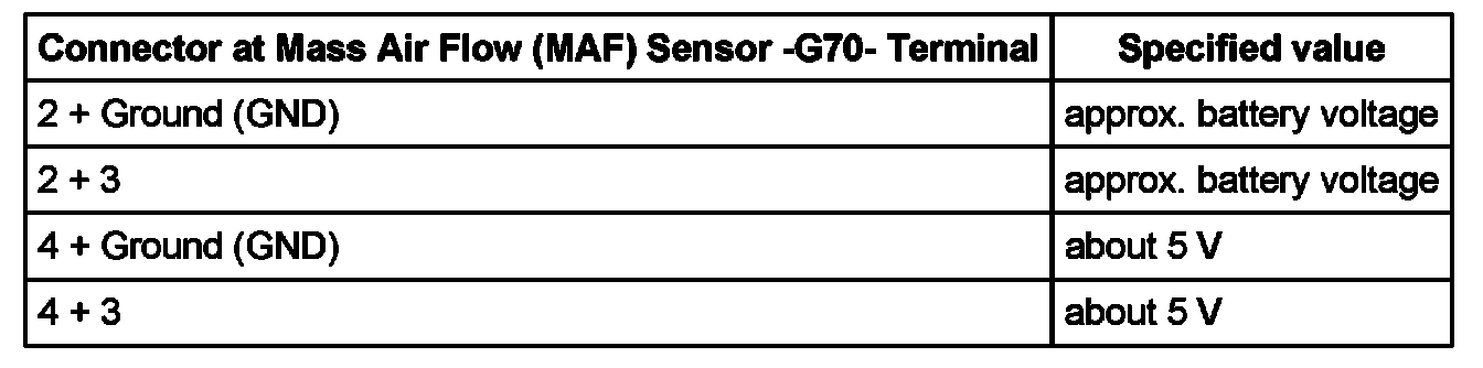 - The respective fuses of Mass Air Flow (MAF) Sensor -G70- must be OK: