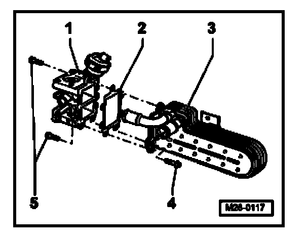 - Assemble bypass flap - 1 - with seal - 2 - and two bolts - 5 - with EGR cooler - 3 - and tighten by hand.
