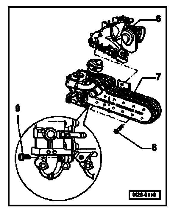 - Mount EGR cooler - 7 - to intake manifold - 6 - with 3 bolts - 8 - tightened by hand (EGR cooler must make contact and must be able to move within bolt holes).
