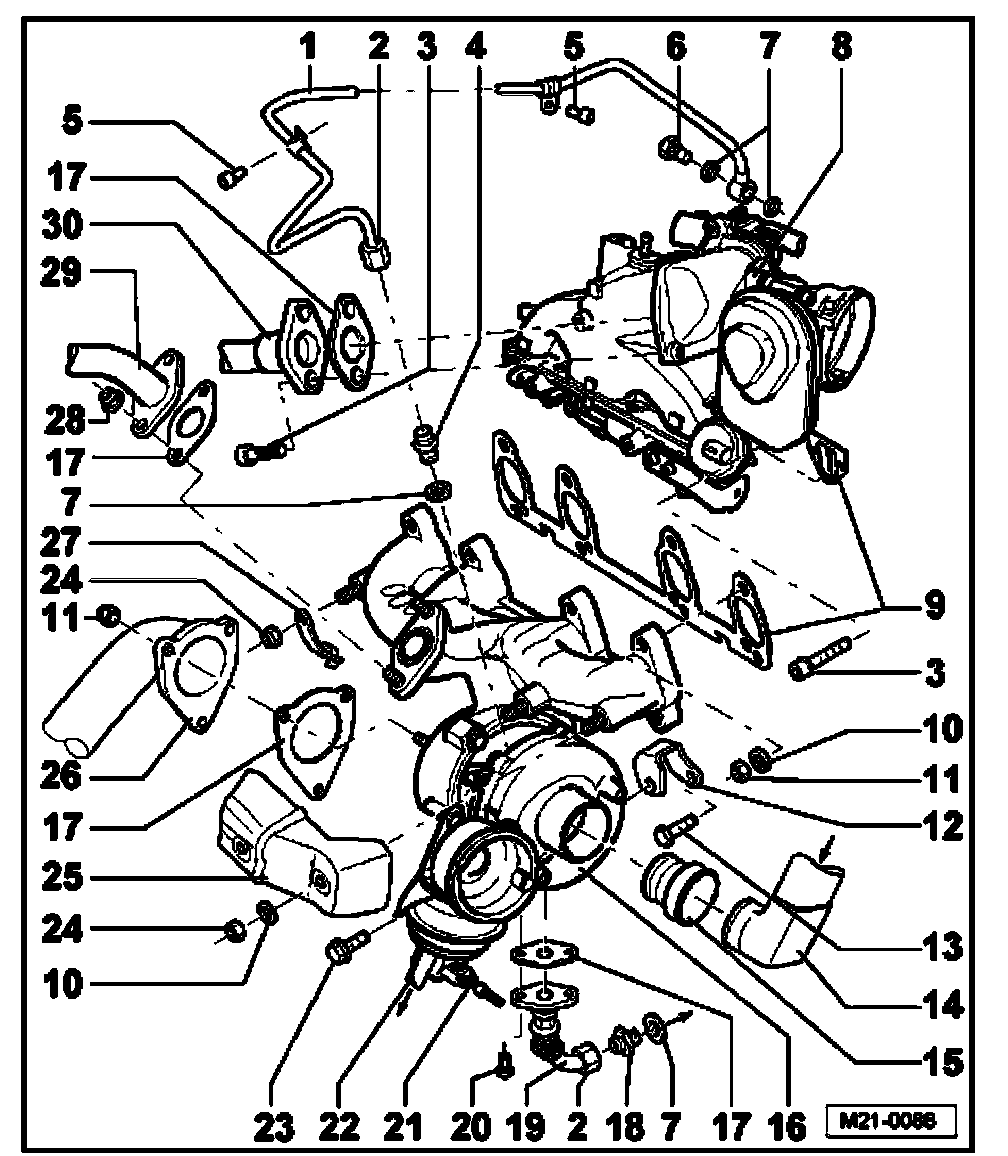 - Before installing, fill turbocharger with oil at connection of oil supply line