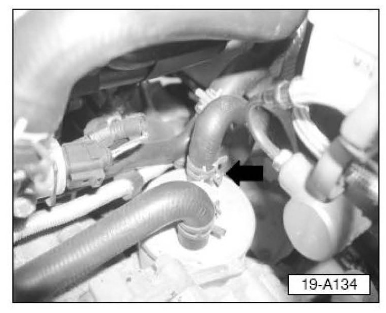 ^ Install coolant hose clamp at coolant pipe using VAS 5024 spring clip pliers.