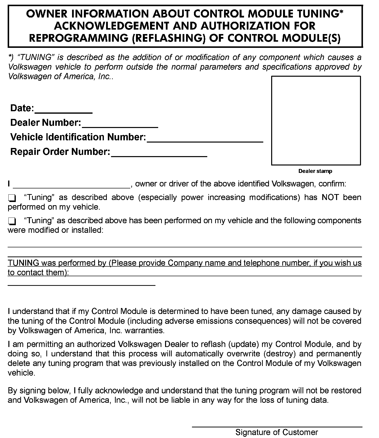 ^ Your Dealership should place vehicle owner on notice in writing, that their ECM was found to have been tuned, and that any damage caused by the tuning of the ECM (including any adverse emissions consequences) will not be covered by Volkswagen of America, Inc. warranties.
