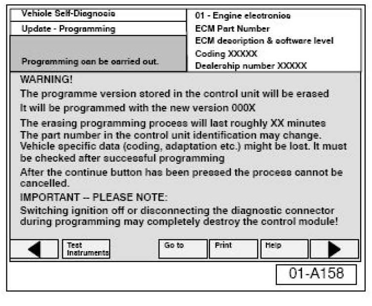 The following "Update - Programming" (flashing) process may overwrite any "TUNED" ECM programming. A "TUNED" ECM is described as any ECM altered so as to perform outside the normal parameters and specifications approved by Volkswagen of America, Inc.