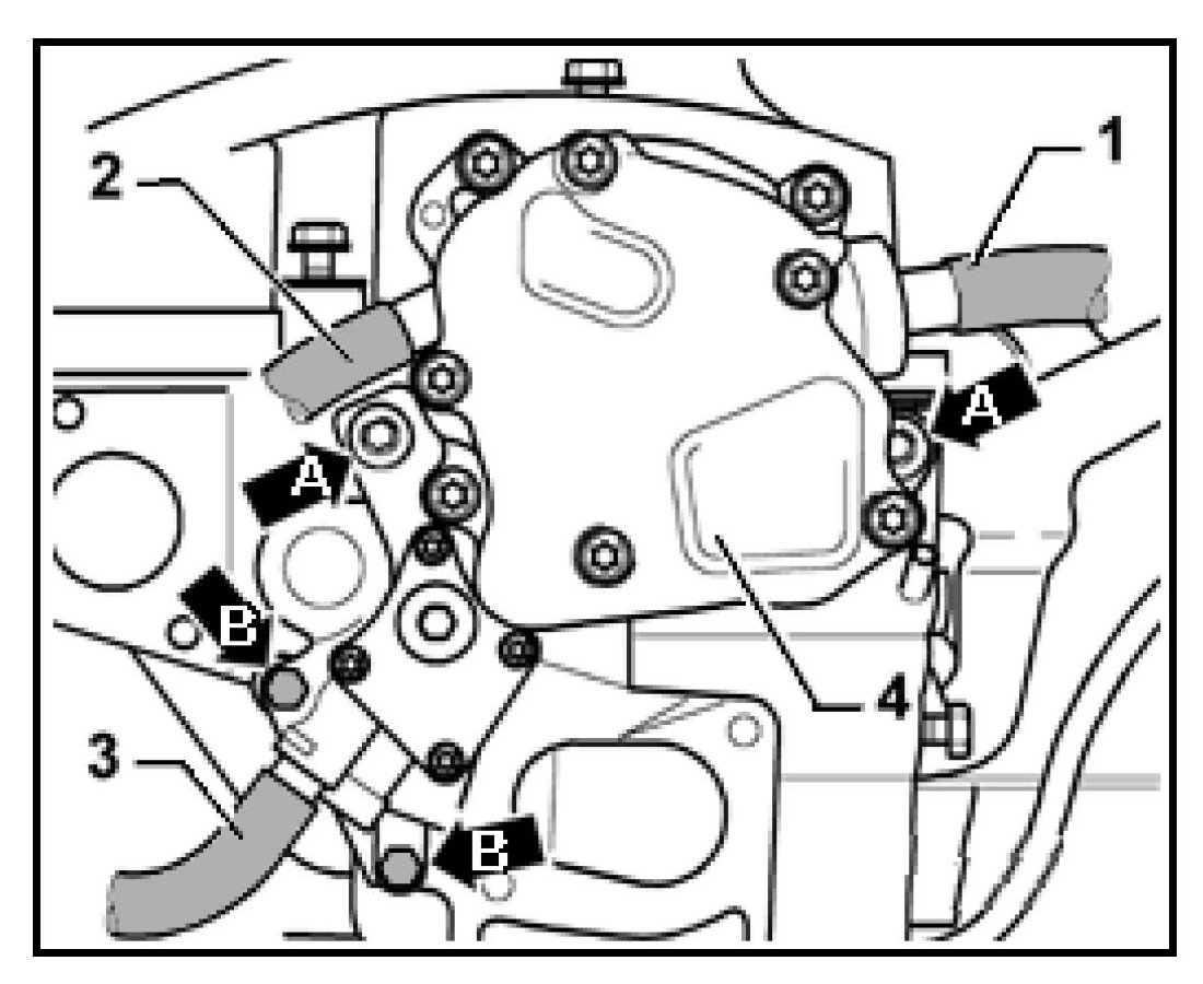 - Tighten upper 6mm socket head bolts - arrow A- to 20 Nm (15 ft. lbs.) and lower 5mm socket head bolts -arrow B- to 10 Nm (7 ft. lbs.)