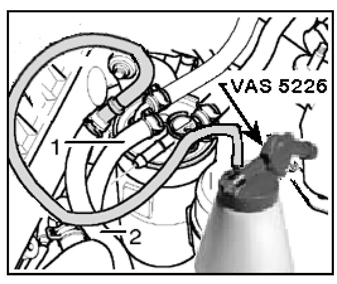 - Connect suction pump VAS 5226 to fuel return hose -2- with blue mark