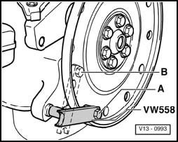 - Secure counterhold VW 558 to drive plate with M8x45 hex bolt. Place two M10 hex nuts between counterhold tool and drive plate.