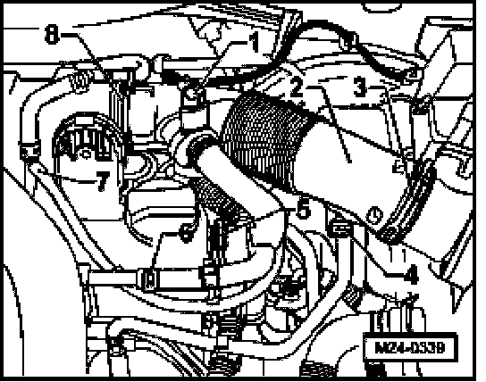 - Release clamps -3- and -8- and remove intake hose -2-.