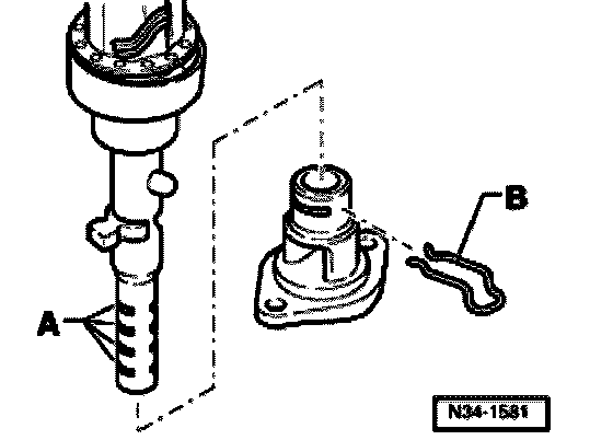The selector shaft is locked into the cover by inserting the spring clip -B- through one of the grooves -A-, with a forward gear engaged.