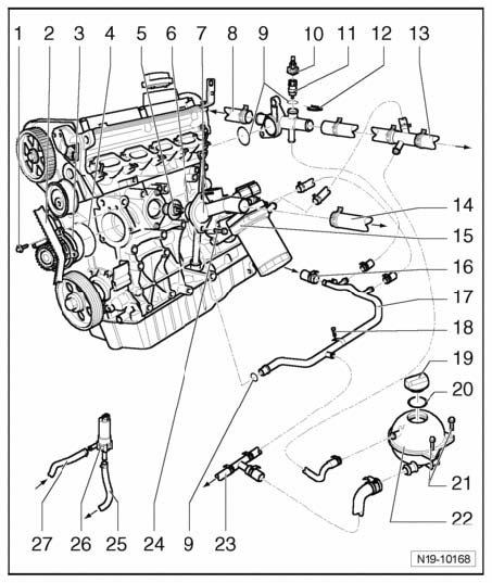 ^ Perform cooling system leakage test with cooling system tester V.A.G 1274 and adapter V.A.G 1274/8.