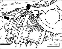 - Remove connecting hoses - arrows - between Secondary Air Injection (AIR) pump/combination valve and Secondary Air Injection (AIR) pump/air filter.