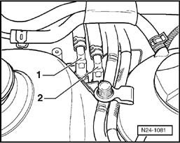 - Pull off supply line - 1 - (with white marking) and return line - 2 - (with blue marking) and catch any released fuel with a shop rag.