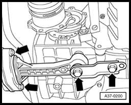 - Remove subframe mount from transmission bracket - arrows - on transmission side from above.