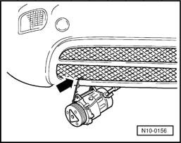 - Secure air conditioning compressor to body - arrow - so that refrigerant lines/hoses are not stressed.