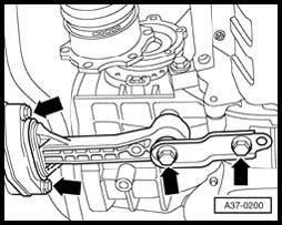 - Remove bolts from transmission side of assembly mounting from transmission bracket at top - arrows -. Carefully lower engine with transmission.