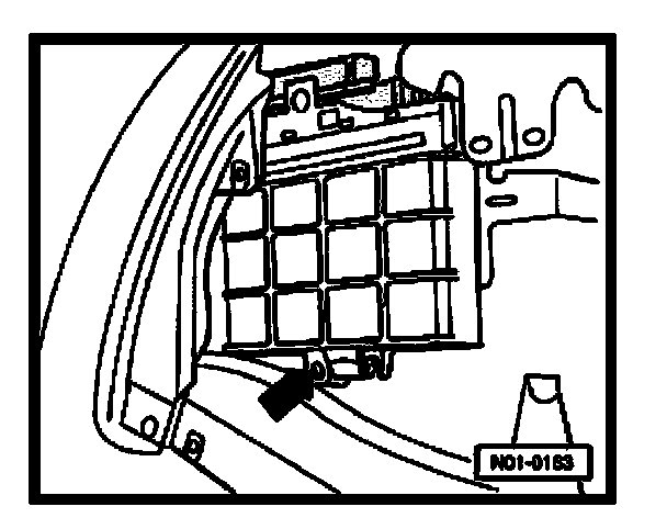 - Connect test box (V.A.G 1598/18A) to control module wiring harness (arrow -1-) and engage (arrow -2-).