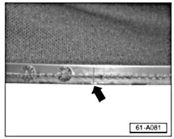 - Locate bottom center of rear glass opening in headliner. This is indicated by a center line in plastic ring -arrow-.
