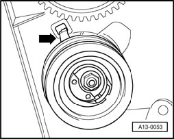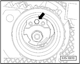 - Insert a hex key into hex hole onto limit stop and press tensioning roller counterclockwise - direction of arrow - until toothed belt tensioning device can be locked with marking plate T10008.