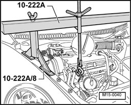 ^ When loosening the front engine mounting bolt the engine must be raised slightly with the support bridge.