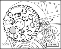 - Loosen camshaft sprocket securing bolts - 1 -, until camshaft sprocket can be moved within elongated holes.
