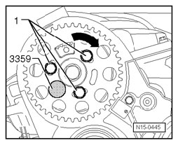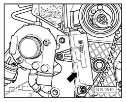 - Turn camshaft sprocket in elongated holes clockwise - direction of arrow - onto limit stop.