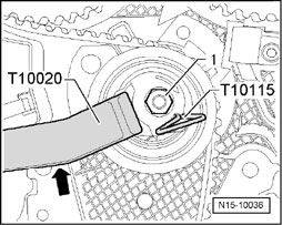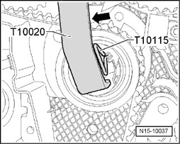 - Turn tensioning roller counter-clockwise with pin wrench T10020 or T10004 until toothed belt tensioning roller can be locked with pin T10115.