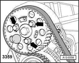- Loosen camshaft sprocket securing bolts - arrows - until camshaft sprocket can be moved within elongated holes.