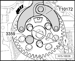 - Place counterhold T10172 with pin T10172/4 as shown. Press counterhold in - direction of arrow - and hold camshaft sprocket to pretension.