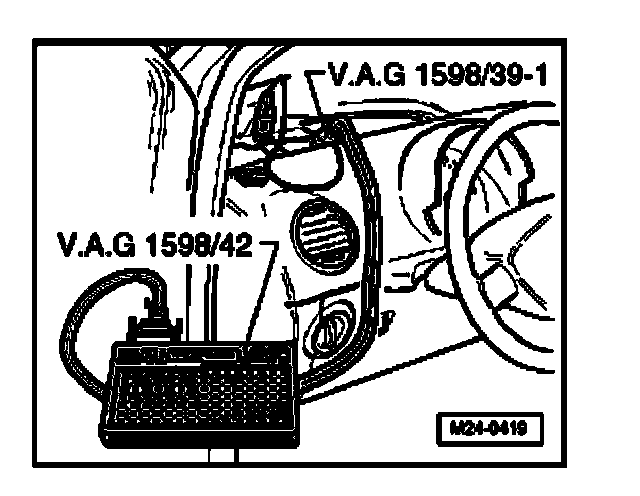 - Connect test box (V.A.G 1598/42) to control module wiring harness using adapter cable (V.A.G 1598/39-1 or V.A.G 1598/39-2). The control module for Diesel-Direct fuel injection system is not connected.