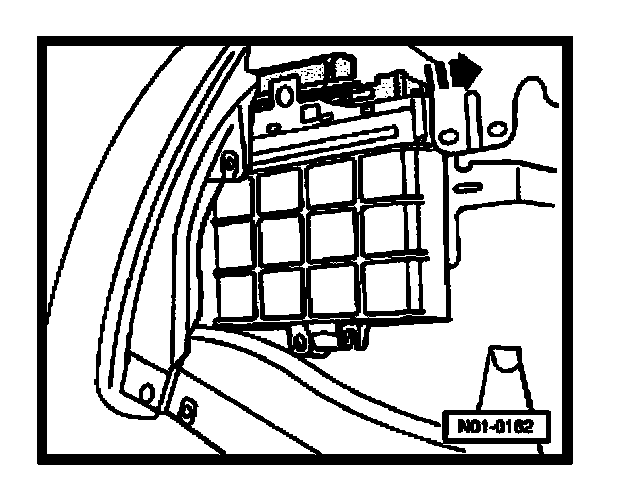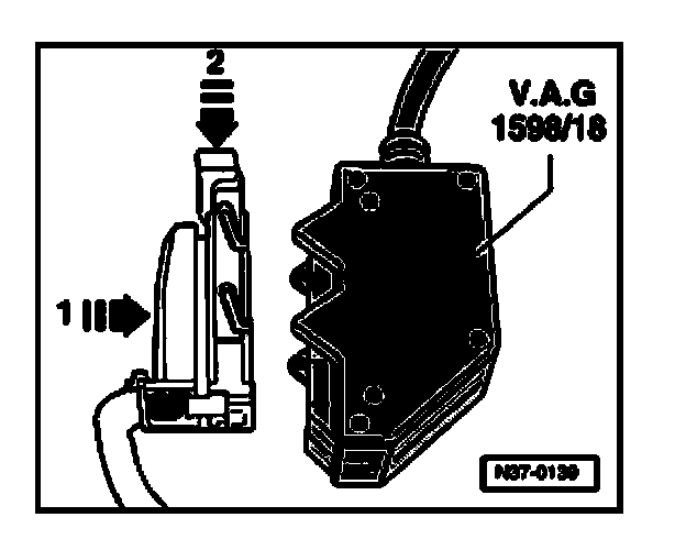 - Connect test box (V.A.G 1598/18) to control module wiring harness -arrow 1- and engage -arrow 2-