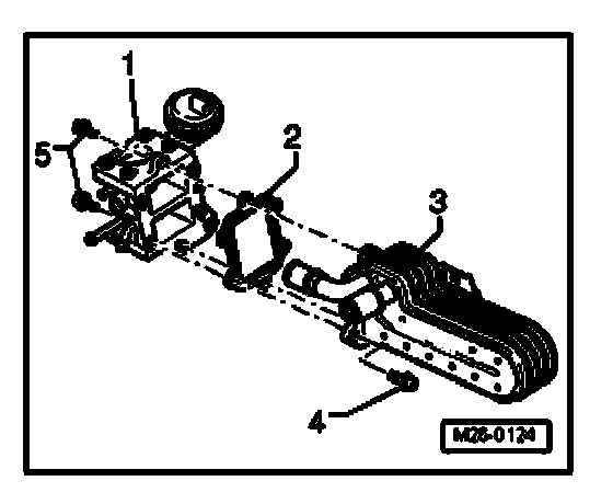 - Assemble bypass flap -1 - with seal - 2 - and two bolts - 5 - together with exhaust gas recirculation cooler - 3 - and tighten these bolts by hand.