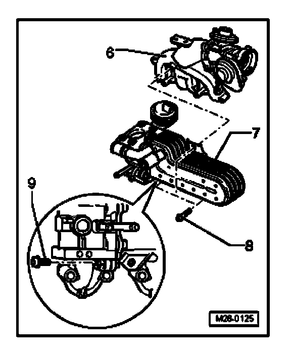 - Fit exhaust gas recirculation cooler - 7 - on intake manifold - 6 - hand-tight using three bolts - 8 - (exhaust gas recirculation cooler must lie against and must be moveable in threaded joints).