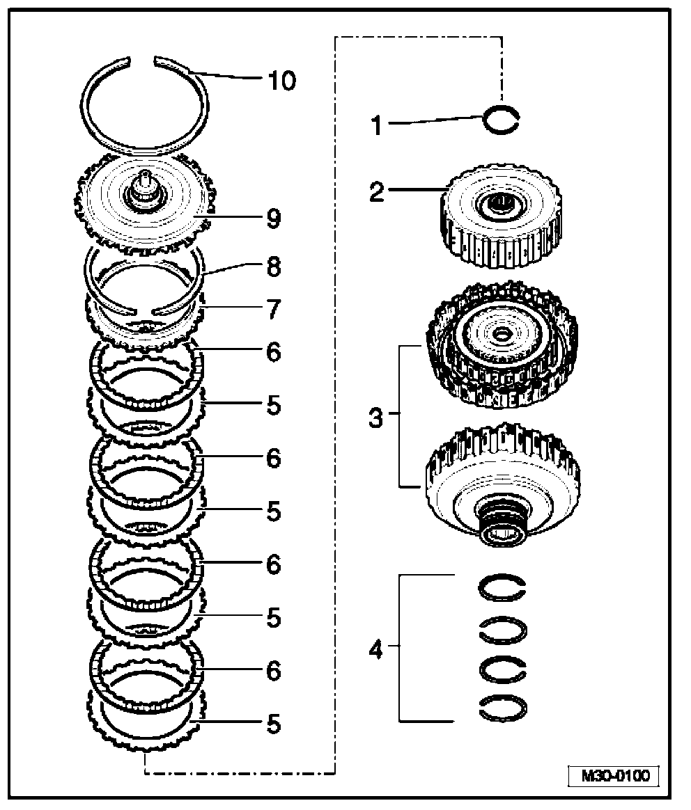 In the event the securing ring was removed in order to insert clutch discs again, it must be replaced with a new ring of the same thickness.