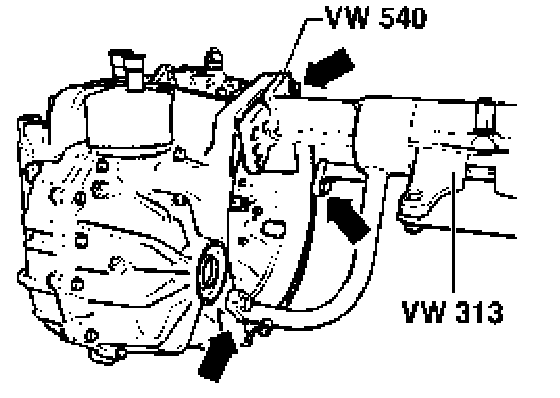 - Secure transmission to engine and transmission support VW 540 (arrows) and install in support clamp VW 313.
