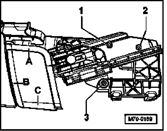 - Height and angle in areas -A-, -B- and -C- are changed by tightening or loosening screws -1-, -2- and -3-.